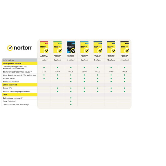 Elektronická licence Norton 360 Deluxe poskytuje komplexní ochranu před malwarem až pro 3 počítačů PC, počítačů Mac, zařízení se systémem Android nebo iOS, plus funkci rodičovské kontroly, která pomáhá chránit vaše děti online, správce hesel pro ukládání a správu hesel a funkci zálohování PC do cloudu. Norton 360 Deluxe zahrnuje také síť VPN pro 3 zařízení a aplikaci ochrana kamery před zneužitím pro počítače PC. Určeno pro nové uživatele i k obnově licencí stávajících uživatelů