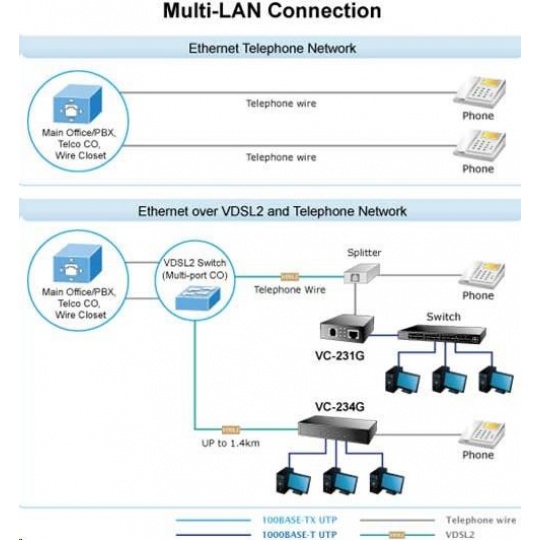 PLANET VC-231G Ethernet po telefonním vedení (technologie VDSL2). 1x LAN RJ-45, 1x VDSL2 RJ-11. Transparentní bridge. G.993.2 VDSL2, G.993.5 G.Vectoring + G.INP. Kapacitně 200/160Mbps na 200m. Dosah až 1,4km. Nastavení DIP přepínači, volitelně Master (CO) / Slave (CPE). Možný provoz na VDSL O2 lince. LRE (Long Reach Ethernet) konvertor ethernetu na VDSL2 (Very-high-data-rate Digital Subscriber Line 2) konvertor ethernetu dovoluje přenést data symetrickým párem vodičů rychlostí až 200Mbitů/s na 200m nebo 30Mbitů/s do vzdálenosti až 1,4km, přenosové rychlosti dle stavu a kvality použitého vedení. Zařízení je univerzální jako master (CO) / slave (CPE) jednotka, nastavení režimu přepínačem. Jednotka podporuje VDSL2 operační módy dle přenosových profilů "17a" a "30a", volbu dle "band Plan997" a G.993.5 G.Vectoring & G.INP postihující symetrický přenos dat vyšší rychlostí i na souběžném vedení. S pomocí externího spliteru lze zachovat hlasovou službu na telefonním vedení bez další úpravy zapojení. S výhodou tak lze využít telefonní kabelová vedení původně určená pro spojení nejen k účastníkům ale i mezi analogovými ústřednami. ISP (internet service provider) poskytovatelům je tak umožněno nabízet multimediální služby, VOD (video on demand), VoIP (voice over IP), Video phone, IPTV, apod. Aplikace VDSL2 s pokročilým G.INP a G.Vectoringem lze provozovat i v rámci aktivních prvků rozhraním SFP diky modulu XL-MGB-VDSL2-R2 (viz. doporučené příslušenství). Modem lze úspěšně provozovat nad VDSL linkami O2. ZÁKLADNÍ SPECIFIKACE Porty: 1 x 10/1000Base-T, RJ-45 1 x VDSL, RJ-11 Podpora přenosu: JumboFrame 2K MAC adres Soulad s normami: IEEE 802.3, IEEE 802.3u, IEEE 802.3ab, IEEE 802.3x, IEEE 802.3p Transparentní pro: IEEE 802.1Q VLAN tag Standard: ITU-T: G.993.1 - VDSL, G.997.1, G.993.2 - VDSL2 (profily 17a/30a), G.993.5 G. - Vectoring a G.INP, G.998 DIP přepínání: volba CPE/CO, volba modulace, volba komunikačního limitu, volba SNR Napájení: z externího adaptéru, 5V/2A Provozní teplota: 0 až 50°C, vlhkost <90% Rozměry: 97 x 70 x 26 mm Hmotnost: 184 g Lze instalovat do šasí: MC-700, MC-1500, MC-1500R Příklad dosahů a rychlostí (down/up Mb/s) na vedení s vodiči AWG24 a lepších: 200m -> 225.34Mb/122.39Mb 400m -> 151.89Mb/78.78Mb 600m -> 90.42Mb/49.93Mb 800m -> 57.70Mb/29.87Mb 1000m -> 45.33Mb/9.21Mb 1400m -> 34.74Mb/5.75Mb Nastavení pro O2 VDSL připojení modem v režimu CPE; další DIP přepínače Transmision, Band, SNR podle kvality linky v routeru na WAN rozhraní aplikovat VLAN ID:848 nad WAN nastavit PPPoE klienta, Login: O2/O2 dále věnujte pozornost nastavení vašeho routeru, jeho firewallu, přístupových práv, UPnP, atd..