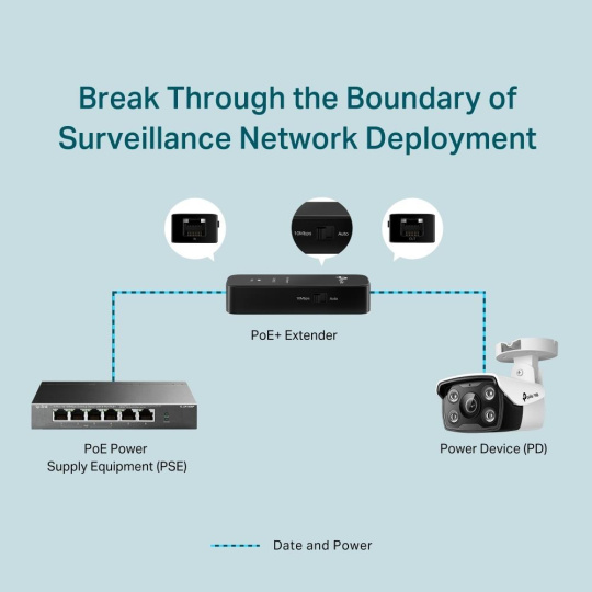 Fast Ethernet PoE+ Extender TL-POE10E rozšiřuje PoE/PoE+ síťové připojení o dalších 100 m – 250 m (10 Mbps režim) od zdroje napájení PoE. TL-POE10E rozšiřuje nasazení sítě o zařízení kompatibilní s 802.3af/at PoE, díky čemuž je ideální pro požadavky na dlouhou kabeláž při kamerových systémech . Vzdálenost již nebude překážkou pro nasazení sítě.
