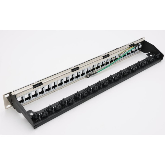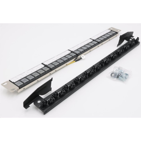 včetně montážní sada M6 do rozvaděčů (4x šroubek + 4x matka + 4x podložka) Kovový patch panel s unikátním způsobem instalace keystonů s vyvazovákem. Čelní panel překryt čtyřmi plasty po 4 otvorech, možno osadit 4 moduly po 6 pozicicíh pro keystony. Zemnící kabel a pozice pro umístění popisek