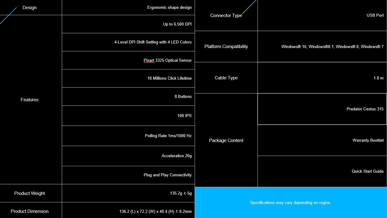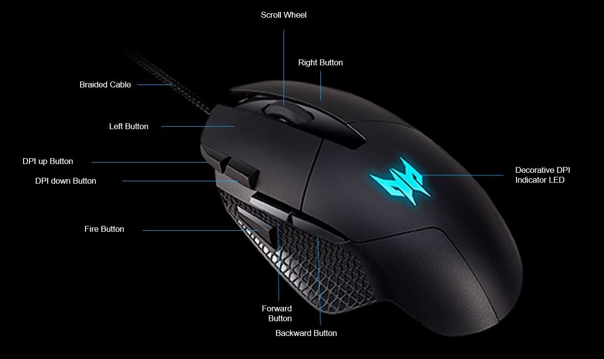 ACER Predator CESTUS 315 - herní myš, 4 levels DPI 800-6500dpi, Pixart 3325 senzor, IPS/speed 100, 8 tlačítek