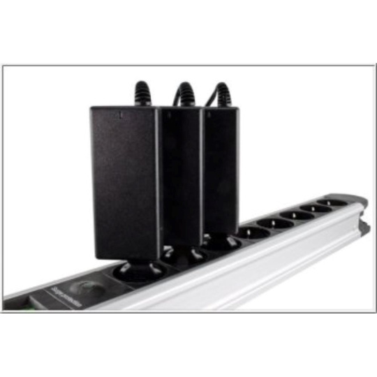 Napájecí adaptér v černém provedení, se vstupním konektorem CEE 7/7 a výstupním IEC C13. Výstupní zásuvka je rovná, německého typu, s ochrannými plíšky po stranách, vhodná pro připojení vidlice, která je vybavena zemnícími plíšky po stranách.