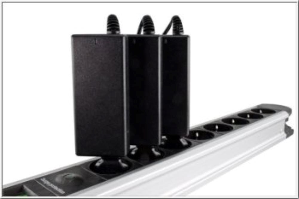 Napájecí adaptér v černém provedení, se vstupním konektorem CEE 7/7 a výstupním IEC C13. Výstupní zásuvka je rovná, německého typu, s ochrannými plíšky po stranách, vhodná pro připojení vidlice, která je vybavena zemnícími plíšky po stranách.