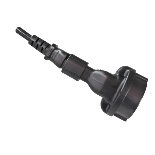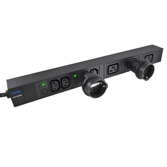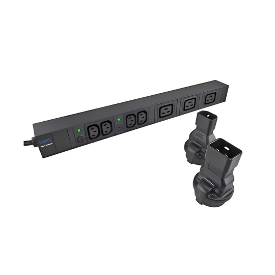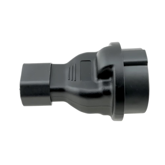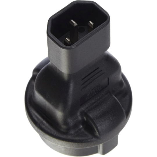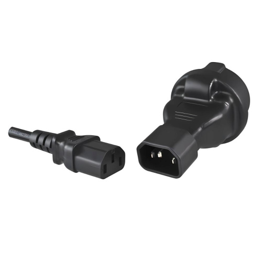 Napájecí adaptér v černém provedení pro UPC, se vstupním konektorem IEC C14 (max. 10 A) a výstupní zásuvkou SCHUKO CEE 7/3 (max. 16 A). Výstupní zásuvka je rovná, německého typu, s ochrannými plíšky po stranách, vhodná pro připojení vidlic vybavených zemnícími plíšky. Je velmi důležité zajistit, aby proud odebíraný ze zásuvky nikdy nepřekročil 10 A, aby nedošlo k přetížení vstupního konektoru C14.