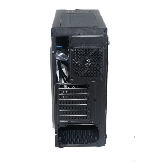 Počítačová skříň se skleněným bočním krytem a RGB podsvětlením panelu.
