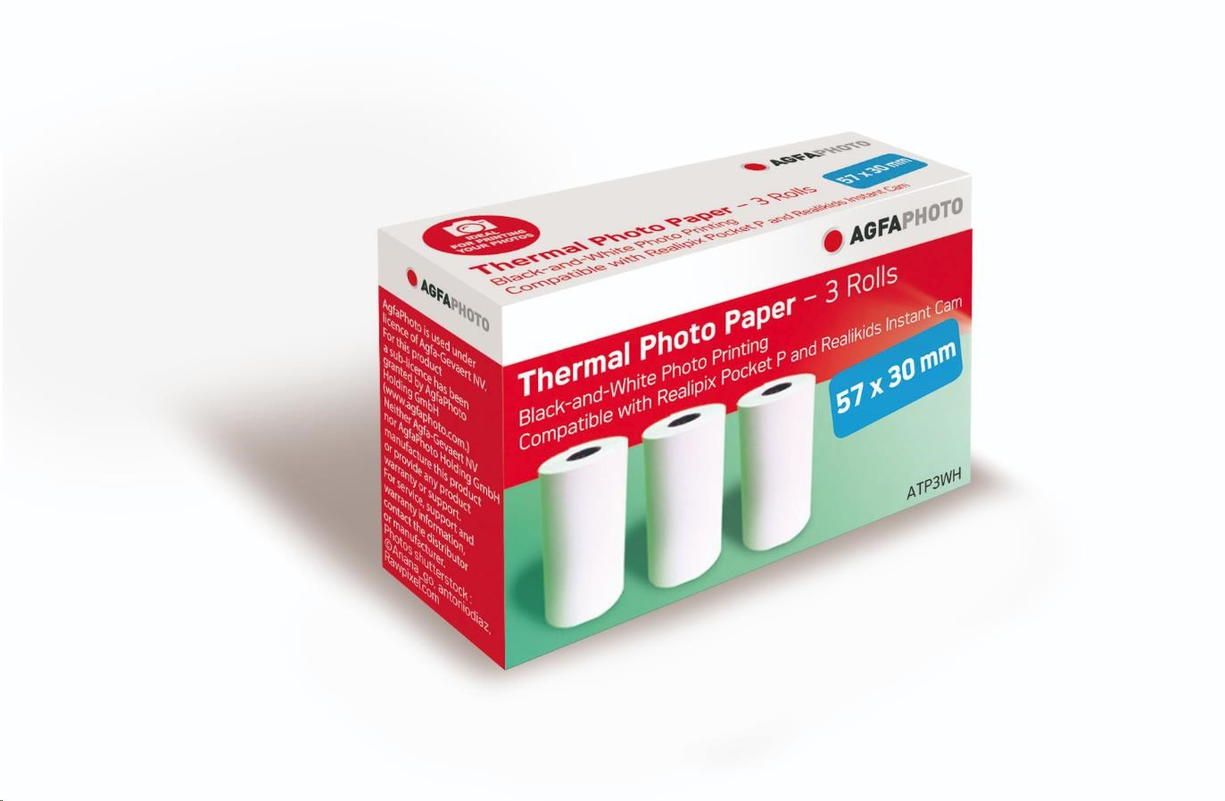 Balení ATP3WH obsahuje 3 role termopapíru ve formátu 57 x 30 mm, které vám umožní vytvořit téměř 300 černobílých výtisků pomocí tiskárny Relipix Pocket P nebo kamery Realikids Instant Cam. Papírové role ATP3WH jsou také kompatibilní se zařízeními s technologií tepelného tisku.