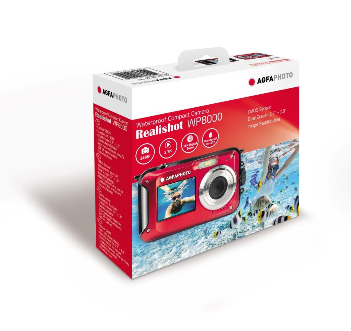 Moře, sníh nebo dokonce déšť? Fotoaparát Realishot WP8000 je vhodný za každého počasí. Můžete ho také využít k fotografování i natáčení videa až do hloubky 3 m. Díky kompaktním rozměrům, lithiové baterie a ochrannému krytu je ideální na cestování.