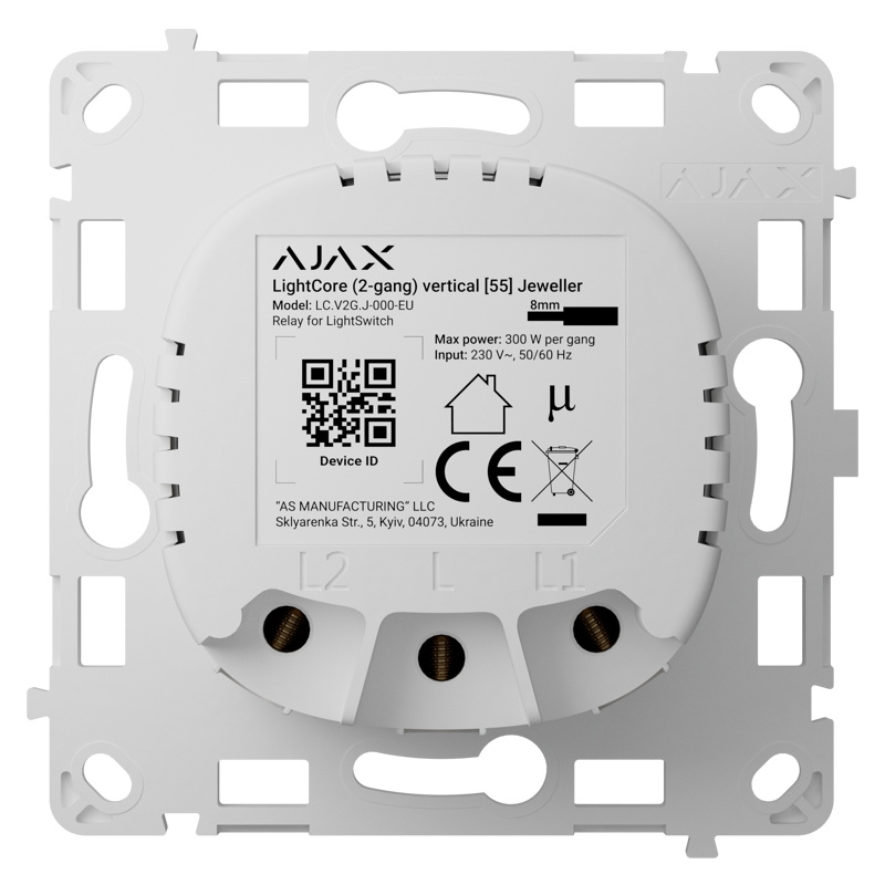 Napájecí napětí: 230V AC / 50 Hz Maximální spínaný výkon: 600 W pro spínače řazení 1, 6 a 7 300 W pro spínače řazení 5 Proudová ochrana: Nad 2\.6 A (Pokud je ochrana aktivována, LightSwitch vypne odpojí napájení a odešle notifikaci do aplikací Ajax). Teplotní ochrana: Nad 60 °C (Pokud je ochrana aktivována, LightSwitch vypne odpojí napájení a odešle notifikaci do aplikací Ajax). Připojení: Fázový vodič (nulový vodič není vyžadován)