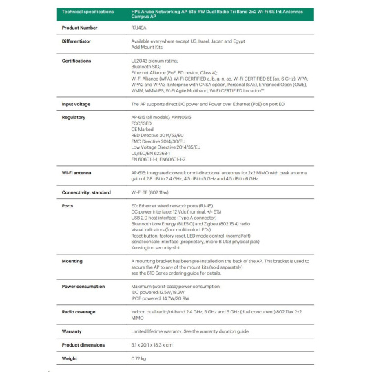 | Aruba AP-615 (EG) Dual-radio Tri-band 2x2:2 802.11ax Wi-Fi 6E Internal Antennas Campus AP | R7J46A |