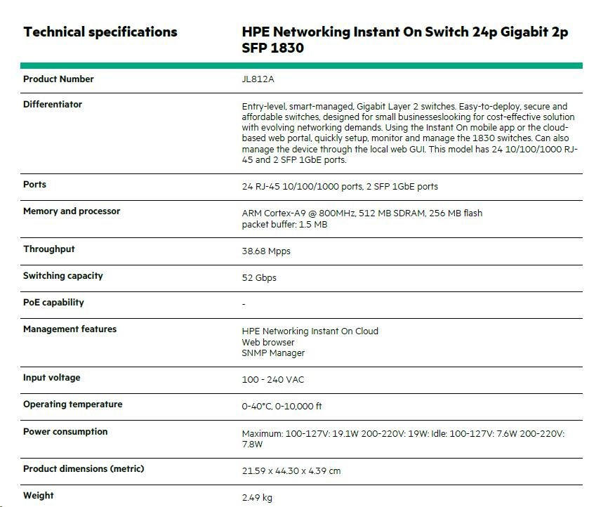 | Aruba Instant On 1830 8G Switch (JL810A) | Aruba Instant On 1830 8G 4p Class4 PoE 65W Switch (JL811A) | Aruba Instant On 1830 24G 2SFP Switch (JL812A) | Aruba Instant On 1830 24G 12p Class4 PoE 2SFP 195W Switch (JL813A) | Aruba Instant On 1830 48G 4SFP Switch (JL814A) | Aruba Instant On 1830 48G 24p Class4 PoE 4SFP 370W Switch (JL815A) | ||||||||