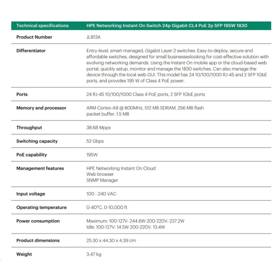 | Aruba Instant On 1830 8G Switch (JL810A) | Aruba Instant On 1830 8G 4p Class4 PoE 65W Switch (JL811A) | Aruba Instant On 1830 24G 2SFP Switch (JL812A) | Aruba Instant On 1830 24G 12p Class4 PoE 2SFP 195W Switch (JL813A) | Aruba Instant On 1830 48G 4SFP Switch (JL814A) | Aruba Instant On 1830 48G 24p Class4 PoE 4SFP 370W Switch (JL815A) | ||||||||