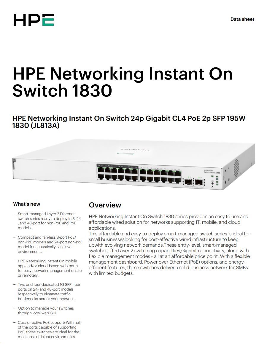 HPE Networking Instant On Switch 24p Gigabit CL4 PoE 2p SFP 195W 1830 (JL813A)