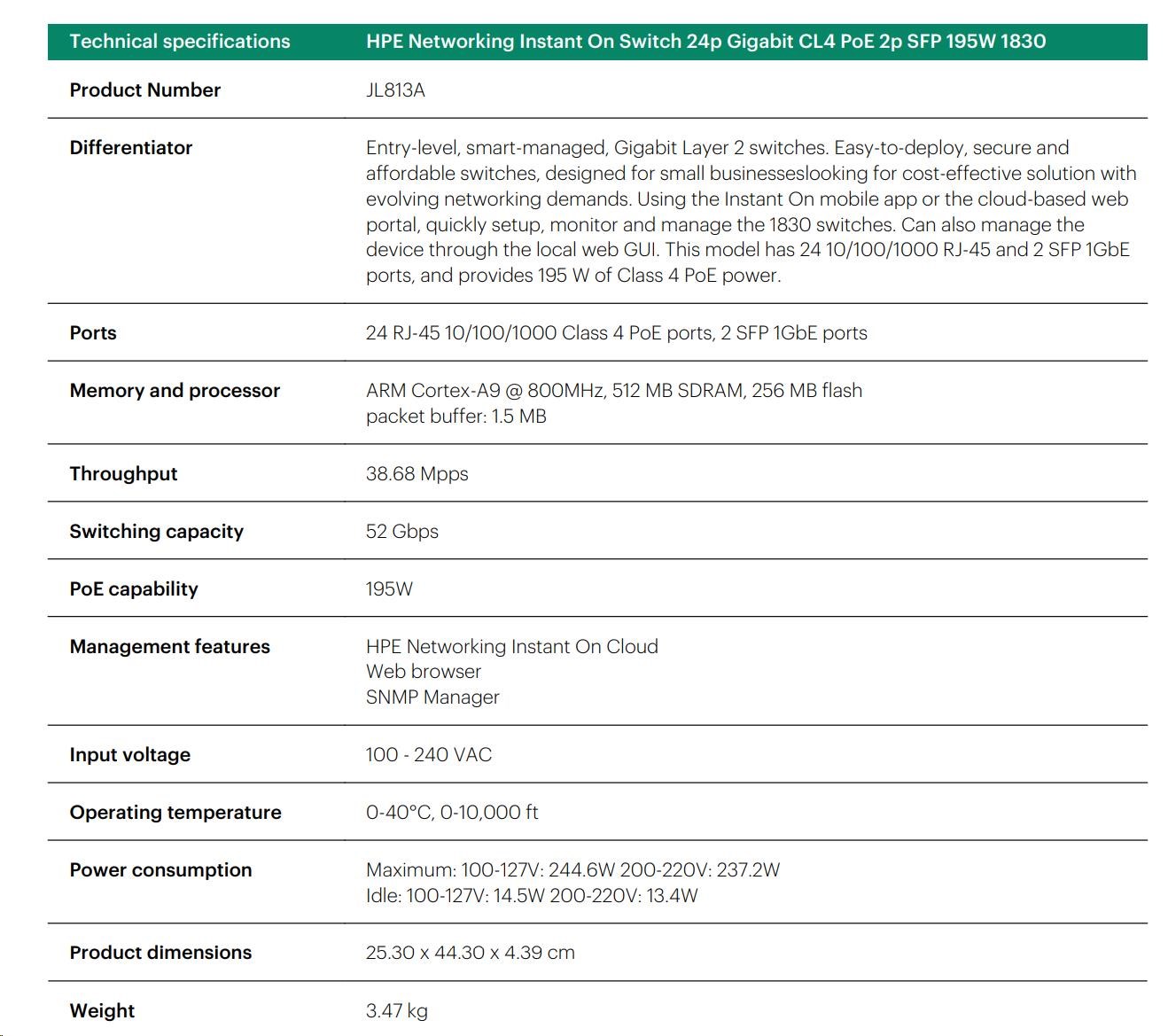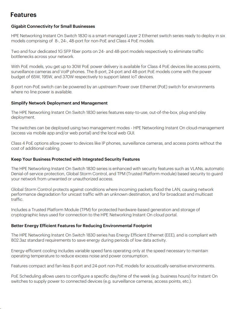 | Aruba Instant On 1830 8G Switch (JL810A) | Aruba Instant On 1830 8G 4p Class4 PoE 65W Switch (JL811A) | Aruba Instant On 1830 24G 2SFP Switch (JL812A) | Aruba Instant On 1830 24G 12p Class4 PoE 2SFP 195W Switch (JL813A) | Aruba Instant On 1830 48G 4SFP Switch (JL814A) | Aruba Instant On 1830 48G 24p Class4 PoE 4SFP 370W Switch (JL815A) | ||||||||