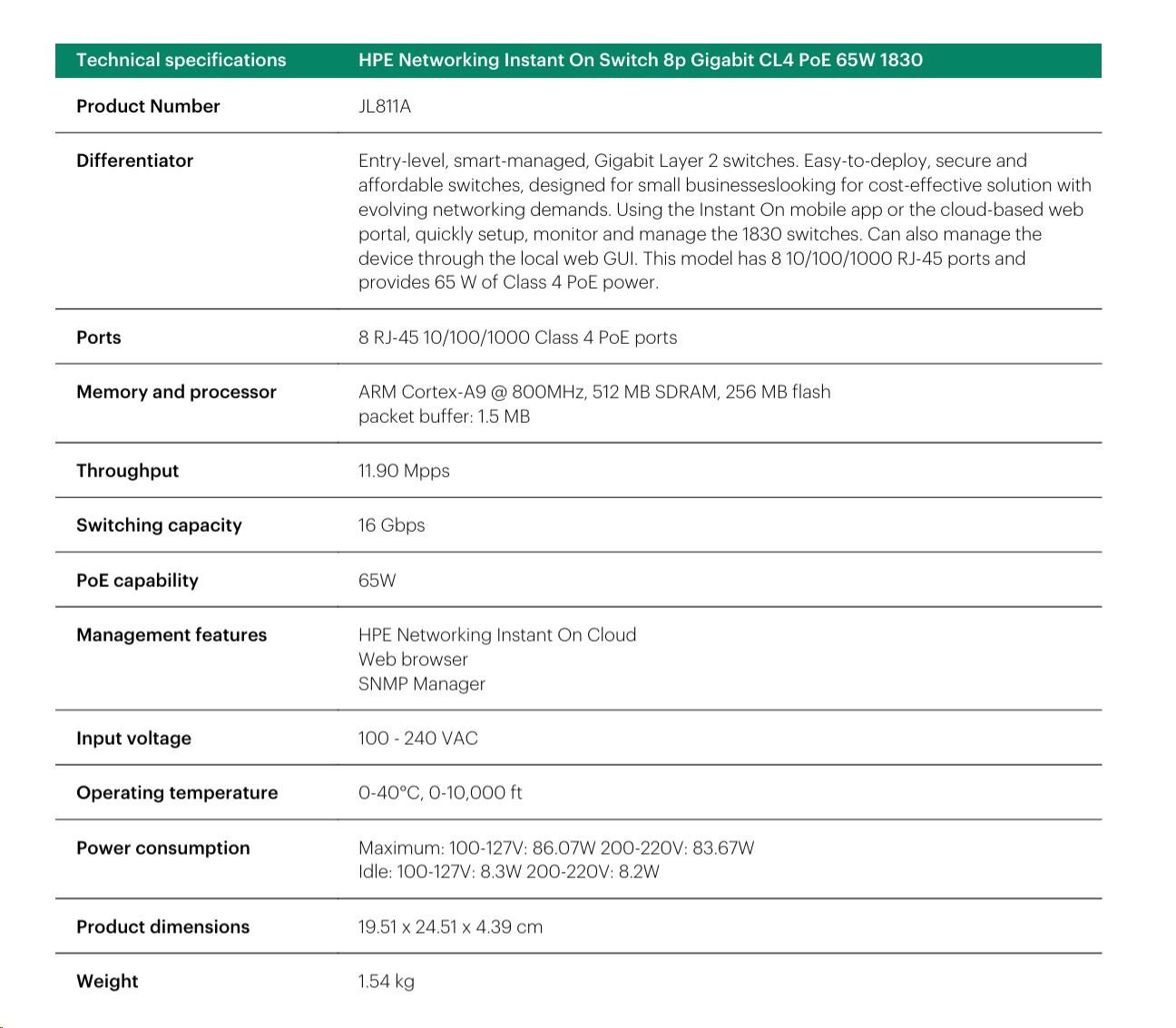 HPE Networking Instant On Switch 8p Gigabit CL4 PoE 65W (fanless) 1830 (JL811A)