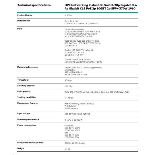 HPE Networking Instant On Switch 20p Gigabit CL4 4p Gigabit CL6 PoE 2p 10GBT 2p SFP+ 370W 1960 (JL807A)