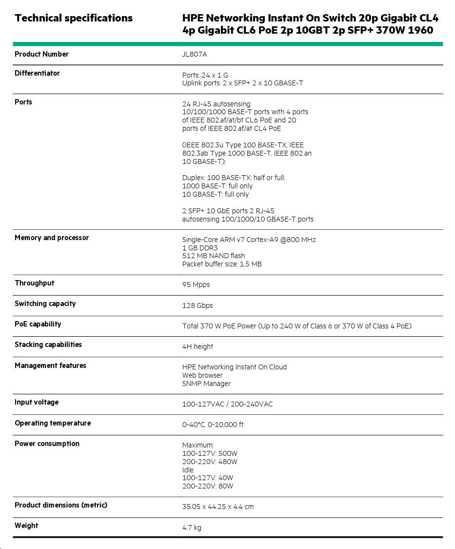 HPE Networking Instant On Switch 20p Gigabit CL4 4p Gigabit CL6 PoE 2p 10GBT 2p SFP+ 370W 1960 (JL807A)