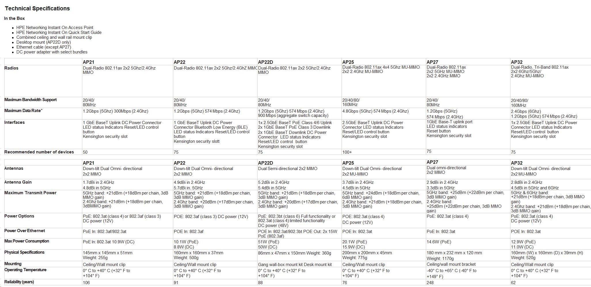 | Ultra-high-speed performance for high-density small businesses. Perfect for gaming, boutique hotels, tech start-ups and professional offices. The rise of the remote and hybrid workplace has placed increased pressure on business networks. Existing Wi-Fi infrastructure is struggling to support the explosion of devices and bandwidthhungry applications - all contributing to spotty video calls and sluggish download speeds. The Aruba Instant On AP25, a 4x4 Wi-Fi 6 access point, is designed to meet the increasing volume of connected devices. Delivering superior performance, coverage, and speed at a competitive price, the AP25 is the perfect access point for small and growing businesses. The Wi-Fi Certified 6TM AP25 delivers faster Wi-Fi speeds, greater capacity, and reduced latency between access points and devices for a superior Wi-Fi experience. AP25 improves efficiency and reduces congestion for networks with many connected devices, making it ideal for high-density environments. And with 4x the capacity of 802.11ac access points, the AP25 provides exceptional user experience, allowing businesses to serve more customers with higher speed and less congestion. Features of the AP25 include orthogonal frequency-division multiple access (OFDMA), multi-user MIMO and target wake time (TWT). With up to 4 spatial streams (4SS) and 160MHz channel bandwidth (HE160), the AP25 provides groundbreaking wireless capabilities for businesses looking to boost performance and future-proof their networks. |