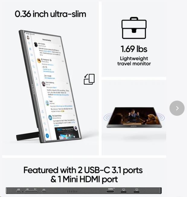 Monitor je vybaven dvěma porty USB-C a jedním konektorem mini HDMI, takže jej můžete snadno připojit k notebooku, smartphonu, konzoli nebo stolnímu počítači. U zařízení s USB-C stačí jediný kabel, který přenáší obraz i napájení. Jedná se o pohodlné řešení, které snižuje počet kabelů.