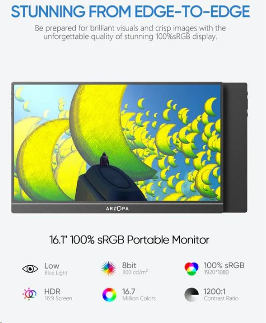 Přenosný monitor Arzopa Z1C 16,1'' je vhodnou volbou pro lidi, kteří potřebují další obrazovku - doma, na služebních cestách nebo při studiu na dálku. Díky kompaktním rozměrům a tenkému provedení se snadno vejde do brašny na notebook a jeho lehká konstrukce (780 g) nezatíží vaše zavazadla. Je dobrou volbou, pokud chcete rozšířit svůj pracovní prostor, aniž by zabíral mnoho místa.