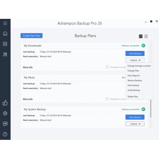 Naše zálohovací řešení je vhodné pro každého, od začátečníka až po specialistu na zabezpečení dat. Proto jsme naše zálohovací plány vytvořili tak flexibilní a všestranné, jak jen to je možné! Nové předvolby zachrání vaše data na několik kliknutí. Chcete zálohovat pouze dokumenty, nebo celý systém? Chcete uložit e-maily, kontakty nebo data prohlížeče? Nebo dáváte přednost sofistikovanějšímu přístupu s vlastními plány speciálně přizpůsobenými vašim potřebám? I velmi sofistikované plány zálohování vyžadují jen několik kliknutí. Jednoduché nebo sofistikované, vytváření zálohovacích plánů je s novým programem Ashampoo Backup Pro hračka!