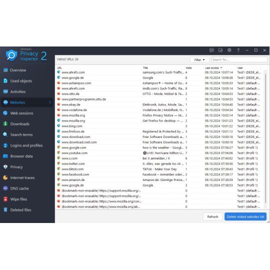 Někdy se stane, že si potřebujete zopakovat své poslední aktivity na internetu. Jak jste se dostali na danou stránku a co jste na ní hledali? Ashampoo Privacy Inspector vám pomůže analyzovat webové relace pomocí rozsáhlých seznamů nebo stromových zobrazení, které zahrnují všechny vaše online aktivity. Oživte svou historii prohlížení webu a už nikdy neztraťte nit.