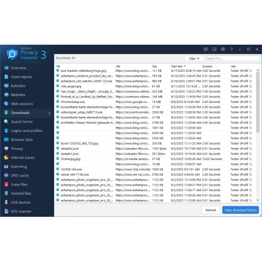 Mějte plnou kontrolu nad historií stahování a vyhledávání. Online zdroj, velikost souboru, doba stahování – s Ashampoo Privacy Inspector máte všechny potřebné informace na dosah ruky – nejen vy, ale i kdokoli jiný, kdo používá váš počítač! Ale žádné starosti, vestavěné filtry vám pomohou identifikovat a smazat citlivé informace během chvilky. Chcete se vrátit k nedávné stránce, ale zapomněli jste, jak se na ni dostat? Ashampoo Privacy Inspector vám s tím také pomůže!