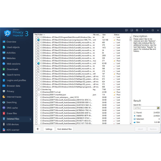 Když už mluvíme o mazání dat: Už jste někdy omylem smazali důležitý soubor? Ashampoo Privacy Inspector ho dokáže obnovit za vás! Vyberte disk a program úhledně vypíše všechny smazané soubory – spolu s možností obnovit je jednotlivě. Je to záchrana!