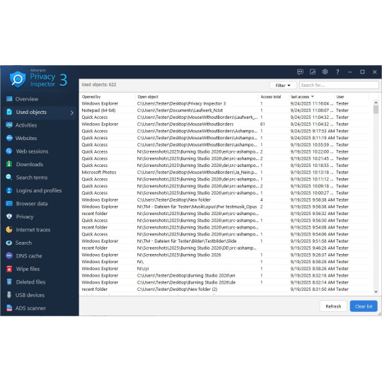 Informace o používání otevřených souborů a složek se neustále shromažďují bez vašeho upozornění. Nechtěli byste vědět, kolik informací o vaší práci váš počítač zaznamenává? Ashampoo Privacy Inspector vám to řekne! Zjistěte přesně, co se děje v zákulisí, když používáte počítač, použijte filtry k upřesnění výsledků a smažte je, kdykoli budete chtít!