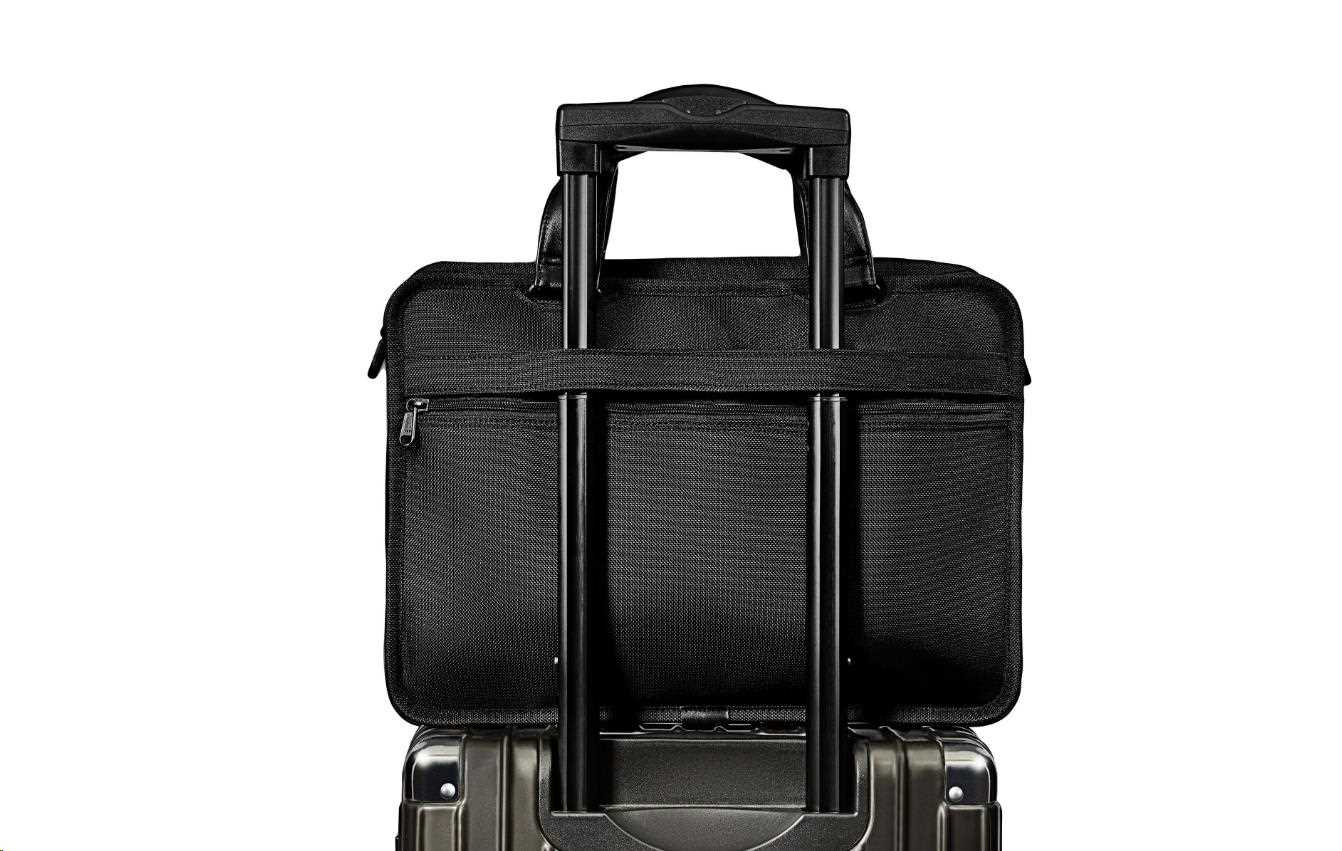 Tašku ASUS Vantage Briefcase je možné nosit za rukojeť, nebo si ji přehodit za rameno pomocí popruhu. Je vybavená také popruhem pro připevnění k zavazadlům.