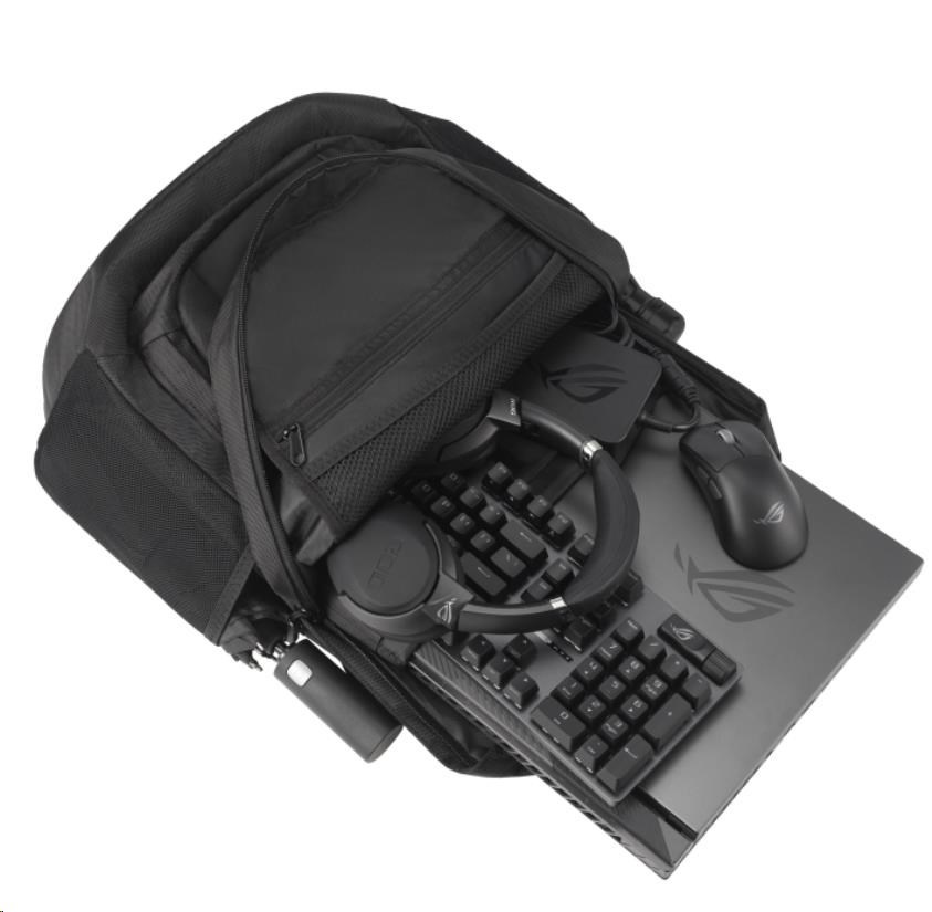 Objem 35 litrů s mnoha vnitřními přihrádkami a polstrovaným pouzdrem na notebook, do kterého se vejde až 18palcový notebook. Odvážný estetický vzhled brašny ROG umocňuje reflexní nápis cybertext. Vysoce odolný polyester 1260D je odolný proti poškrábání a vodě. Osobní věci bezpečně uložíte do skrytých zadních kapes.