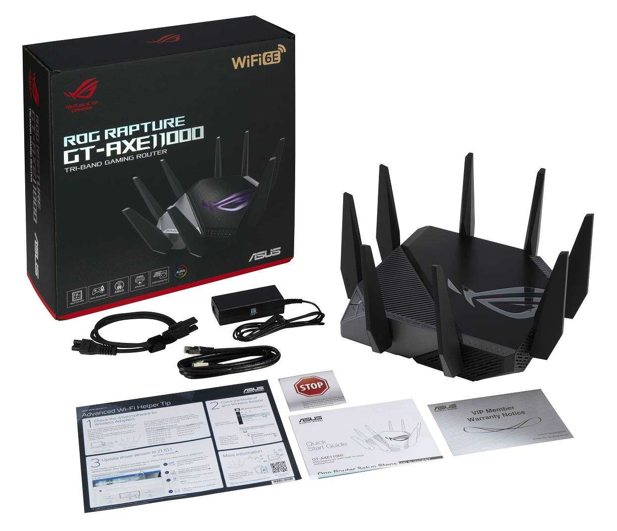 ROG Rapture GT-AXE11000 Třípásmový herní router GT-AXE11000 WiFi 6E (802.11ax), nové pásmo 6 GHz, 2.5G WAN/LAN port, kompatibilní s PS5, agregace WAN, VPN Fusion, tříúrovňová herní akcelerace, zabezpečení sítě zdarma a podpora AiMesh Standard WiFi nové generace – první třípásmový WiFi 6E router na světě zvyšuje rychlost až 11 000 Mb/s. Nové pásmo 6 GHz – Širší kanály a vyšší kapacita přinášejí vyšší výkon, nižší latenci a menší rušení. 2.5G WAN/LAN Port – Veškerý síťový provoz procházející přes 2.5G port má nejvyšší prioritu a 2.5G port tak dokáže plně využít potenciál WiFi 6. Výkon díky dokonalé technice – Čtyřjádrový procesor, pokročilý chladicí systém a optimalizovaný design antény přinášejí výpočetní schopnosti na zcela nové úrovni. Tříúrovňová herní akcelerace – Zrychlete přenos herních dat na každé zastávce, od vašeho zařízení až po herní server. RJ45 for Gigabits BaseT for WAN x 1, RJ45 for Gigabits BaseT for LAN x 4, RJ45 for 2.5G BaseT for WAN/LAN x 1 ROG Rapture Wifi 6 802.11ax Tri-band Gigabit Gaming Router Wifi 6 802.11ax 1148Mbps (2.4G) Wifi 6 802.11ax 4804Mbps (5GHz) Wifi 6E 802.11ax 4804Mbps (6GHz) OFDMA + MU-MIMO tech, 1024 QAM, Triple level Game Acceleration, Aura RGB lighting, ROG Boost Key, 2.5G Multi-Gigabit Gaming Port, WiFI Radar and Zero Wait DFS, AiProtection Pro, VPN Fusion Adaptive QoS, Bandwidth control, AiMesh, ASUS Roter APP (ROG theme).