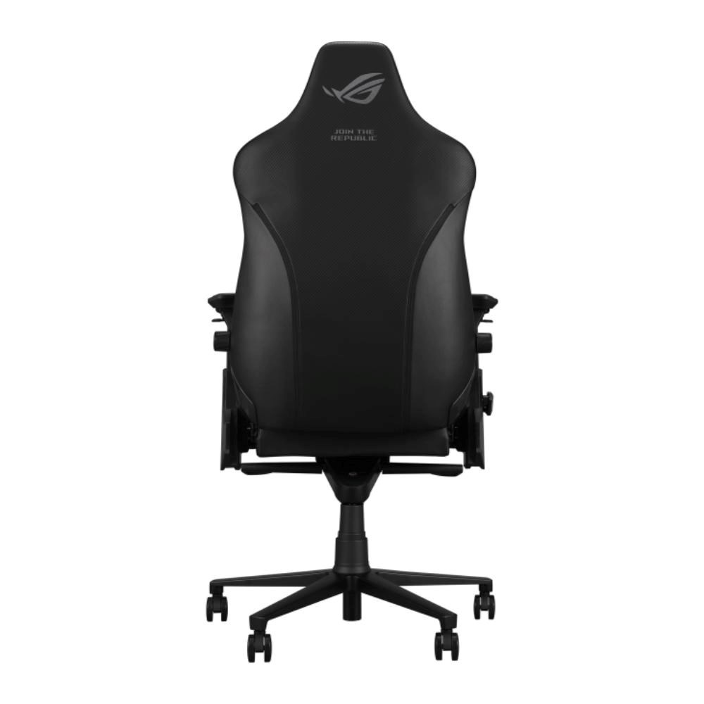 Herní židle ROG Courser Core s nastavitelnou bederní opěrkou z pěny tvarované za studena pro lepší oporu a proudění vzduchu, 4D područkami, ultraširokým sedákem, magnetickým podhlavníkem a dynamickým systémem synchronizovaného naklápění.