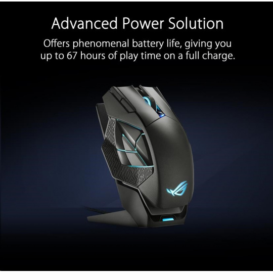 - Advanced Power Solution - ROG Spatha X offers phenomenal battery life, giving you up to 67 hours of play time on a full charge. And if the battery does run low, just 15 minutes of charging via USB-C or the charging dock provides up to 12 hours* of intense wireless gaming.