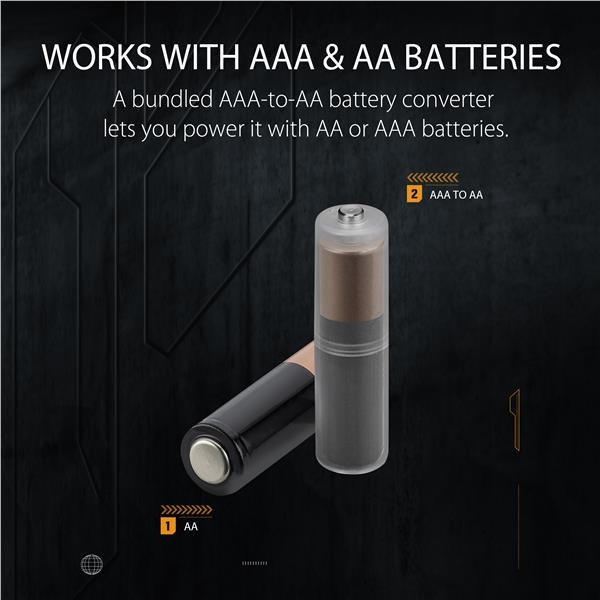 - Works with an AA or AAA batteries via the bundled battery converter holder for a 10% weight reduction