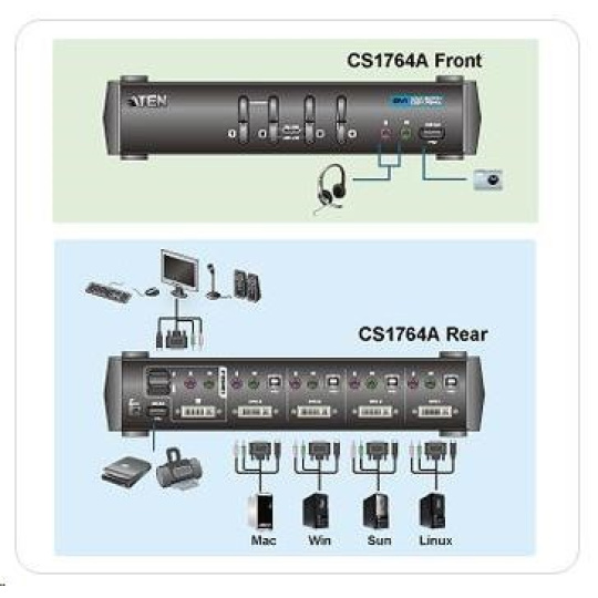 CS1764A ATEN 4-port DVI KVMP USB, 2port USB HUB, audio, 1.2m kabely 4PC - 1 DVI + 1 USB kláves. + 1 USB myš + 2 USB periferie Umožňuje ovládat pomocí USB konzole (klávesnice + myš + DVI monitor) až 4 počítače a dvě další USB 2.0 periferie. - extrémní kvalita videa až 1920 x 1200, 60Hz; DDC2B - umožňuje spravovat 4 PC na jedné kl.,m.,monitoru a dvě dalši USB 2.0 zařízení - možnost připojit počítače po USB - možnost nezávislého přepínání PC a USB a audio zařízení - včetně kabelů pro propojení PC-přepínač - multiplatformní podpora - Windows, Linux, Mac a Sun - výběr PC pomocí hotkey kláves nebo tlačítka na předním panelu - včetně kabelů, v sadě - umožňuje i přepínání audia (až 2.1 audio) - DVI digital a analog podpora monitoru - HDCP compliant - Video DynaSync™ - uchová informaci o monitoru konzole EDID (Extended Display Identification Data) - Power on detection - jestliže je počítač vypnut, přepne na další aktivní port - Sun /Mac podpora klávesnice a její emulace - Auto Scan Mode V balení: 1x CS1764A USB 2.0 DVI KVMP™ Switch 4x Kabelový set pro připojení 4 PC (DVI-D) 1x Napájecí adaptér 1x Manuál 1x Quick Start příručka Podpora Windows 7..