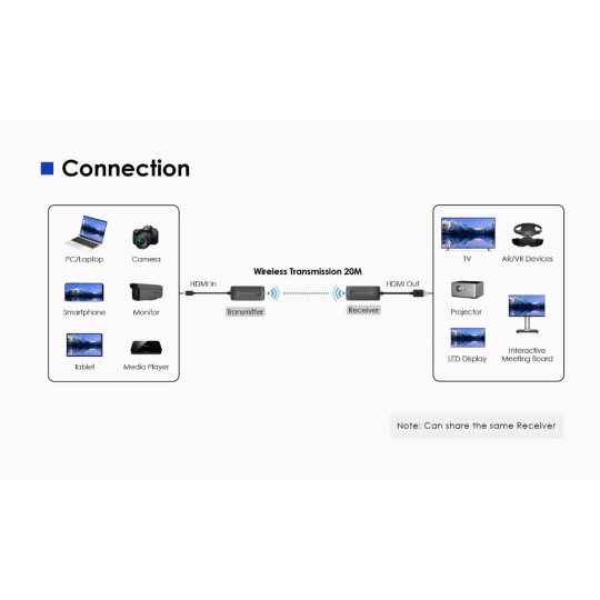 - Poporuje bezdrátový přenos rozlišení 4K@60Hz a Full HD 1080p na vzdálenost až 20m