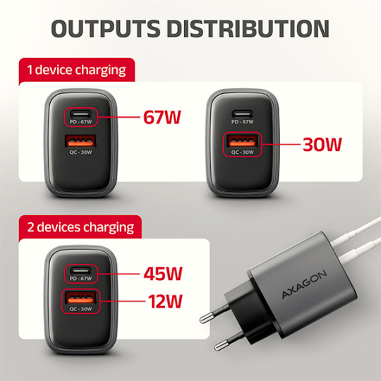 Cestovní nabíječka do sítě AXAGON ACU-PQ67D GaN umožňuje rychlé nabíjení až dvou mobilních zařízení současně. Díky celkovému výkonu 67W dokáže nabíječka dobíjet notebooky, tablety, telefony a další mobilní zařízení nejvyšší možnou rychlostí. Adaptér nabízí nejen standardní USB-A konektor, ale také oboustranný USB-C konektor. Přehledný LCD displej zobrazuje aktuální výkon nabíjení.