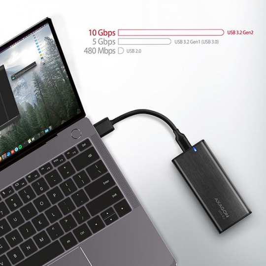 SATA 6G rozhraní dovolí užívat si plnou rychlost M.2 SATA SSD disků. Díky rychlému USB 3.2 Gen 2 rozhraní je přenosová rychlost až 10Gb/s. Externí M.2 box podporuje i další moderní funkce např. UASP, TRIM a umožňuje čtení S.M.A.R.T. informací monitorujících stav disku. Podpora úsporného režimu při nečinnosti.