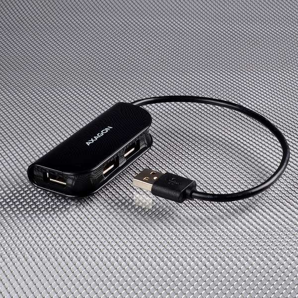 Čtyřportový USB 2.0 READY hub AXAGO HUE-X4B s napevno uchyceným USB kabelem.