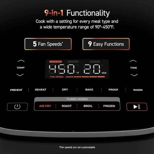 Chcete si každý den pochutnat na různých lahodných pokrmech, aniž byste se museli vzdát svého zdraví a času? Pak je Cosori TurboBlaze právě pro vás. Tato horkovzdušná fritéza využívá technologii stejnosměrného (DC) motoru, která zajišťuje, že vaše jídla budou hotová až o 46 % rychleji* než v běžných fritézách se střídavým (AC) motorem. Navíc s 9 přednastavenými programy a 5 rychlostmi ventilátoru můžete snadno připravovat své oblíbené pokrmy s minimem oleje, nebo úplně bez něj. Cosori TurboBlaze je ideální pro každou domácnost, která chce vařit rychle, snadno a zdravě.