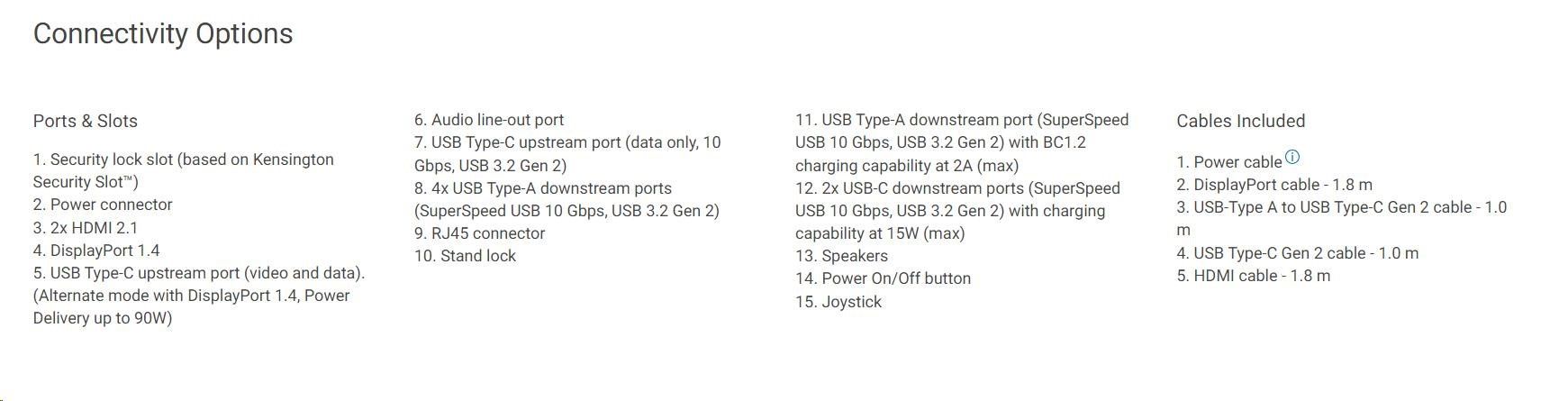 | 1. Security lock slot (based on Kensington Security Slot™) 2. Power connector 3. 2x HDMI 2.1 4. DisplayPort 1.4 5. USB Type-C upstream port (video and data). (Alternate mode with DisplayPort 1.4, Power Delivery up to 90W) 6. Audio line-out port 7. USB Type-C upstream port (data only, 10 Gbps, USB 3.2 Gen 2) 8. 4x USB Type-A downstream ports (SuperSpeed USB 10 Gbps, USB 3.2 Gen 2) 9. RJ45 connector 10. Stand lock 11. USB Type-A downstream port (SuperSpeed USB 10 Gbps, USB 3.2 Gen 2) with BC1.2 charging capability at 2A (max) 12. 2x USB-C downstream ports (SuperSpeed USB 10 Gbps, USB 3.2 Gen 2) with charging capability at 15W (max) 13. Speakers 14. Power On/Off button 15. Joystick |