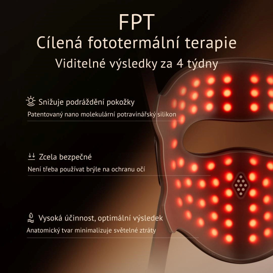 - Efektivní domácí terapie – až 6x účinnější než běžné LED masky. Patentovaná cílená fototermální technologie koncentruje světelnou energii do přesného bodu a působí přímo v hlubokých vrstvách pokožky.