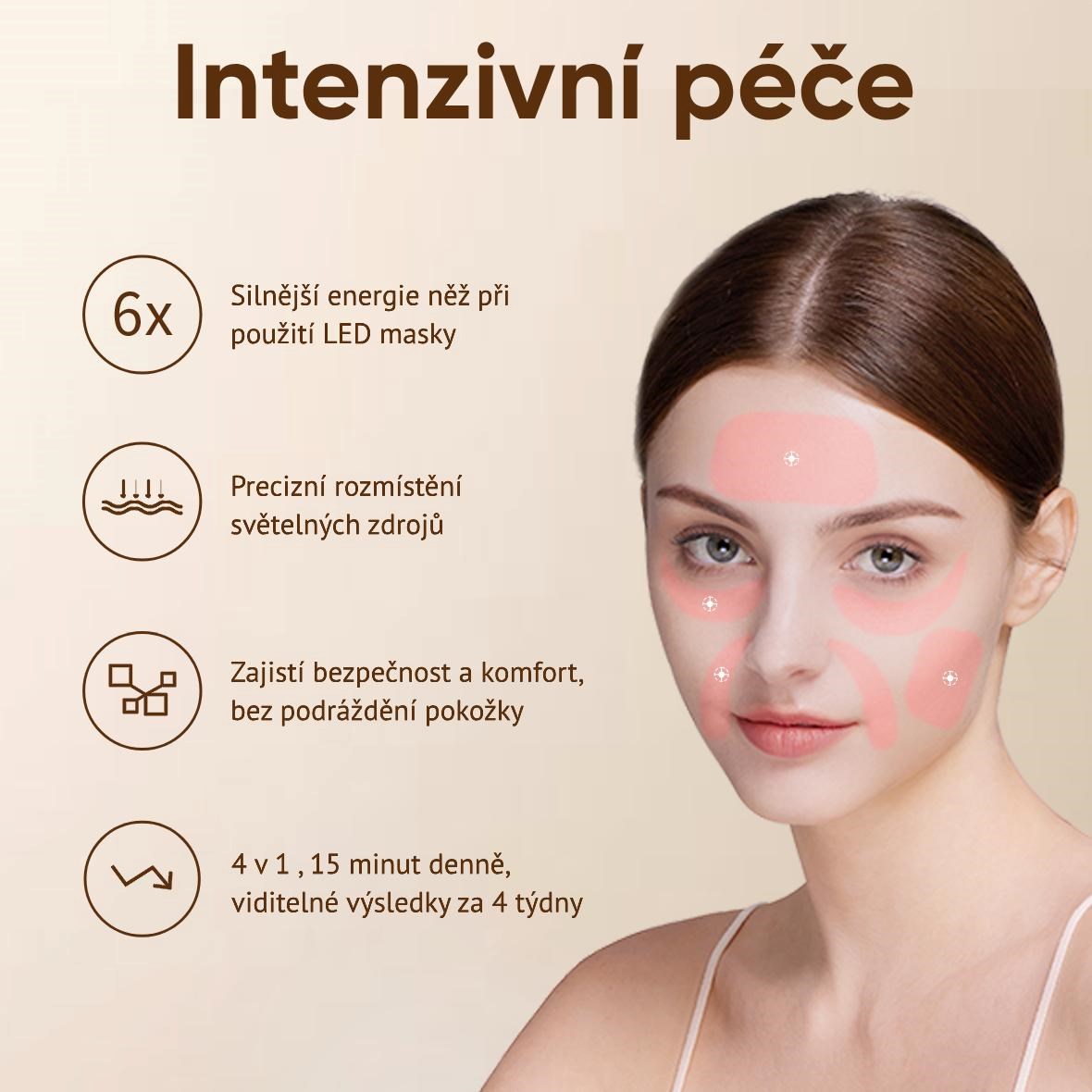 - Efektivní domácí terapie – až 6x účinnější než běžné LED masky. Patentovaná cílená fototermální technologie koncentruje světelnou energii do přesného bodu a působí přímo v hlubokých vrstvách pokožky.