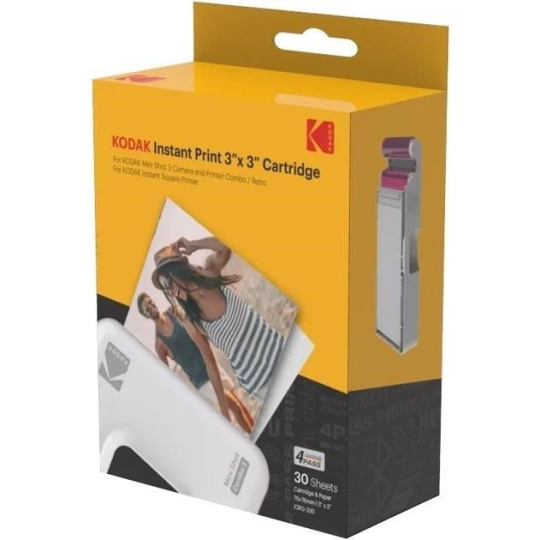 Kazeta KODAK 4PASS All-in-One Cartridge ICRG-360 je kompatibilní s tiskárnami KODAK Mini 3 a Mini Shot 3. Každé balení obsahuje 1 krabičku po 3 kazetách, což vystačí na tisk celkem 30 fotografií.