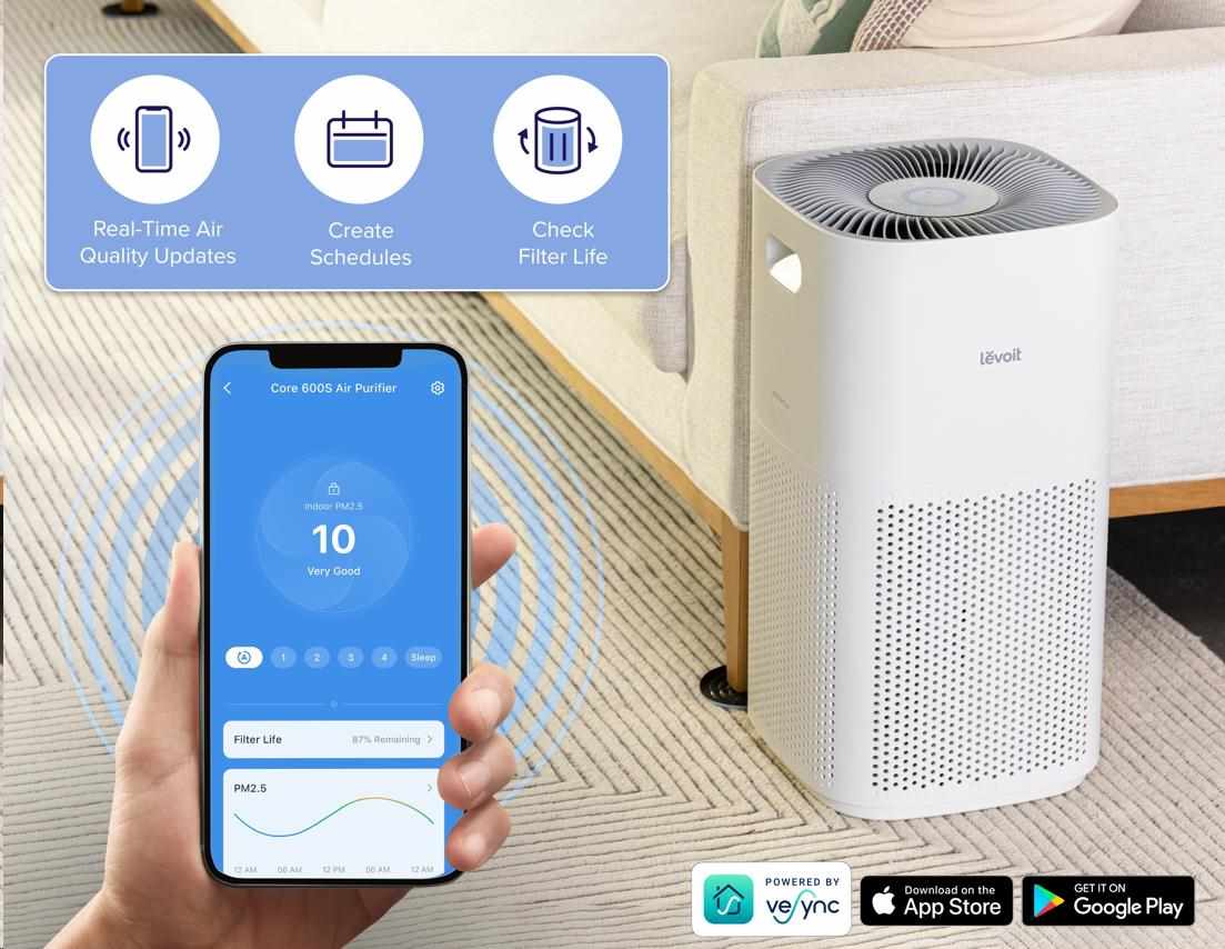 Chytrou čističku vzduchu Levoit Core 600S Smart můžete ovládat přímo na displeji nebo také přes aplikaci určenou pro smartphony a tablety Android a Apple. V aplikaci si můžete nastavit různé režimy, výkon, sledovat proces čištění, úroveň znečištění vzduchu nebo stav, v jakém se filtr nachází. Přes Amazon Alexa nebo Google Assistant můžete také zařadit čističku do svého Smart Home a dávat jí pokyny hlasem.