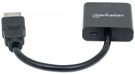 The Manhattan HDMI to VGA Converter helps establish a fast, simple and convenient link between newer HDMI-equipped desktop and notebook computers and other media sources with existing VGA monitors, projectors and other display devices. The Manhattan HDMI to VGA Converter is easy and quick to install and requires no complicated configuration or setup to help extend the service life and fully realize the investment and value of legacy VGA displays, projectors and other equipment. This low-power, cost-effective and reliable solution allows users to transition to HDMI bandwidths, resolutions, Deep Color and more without the expense of upgrading to newer and costly monitors and projectors. Its integrated, all-in-one design helps achieve a compact, integrated solution that eliminates unnecessary cables, tangles and clutter to keep installations and work spaces neat and orderly. Its Micro-USB port allows for additional power if required.