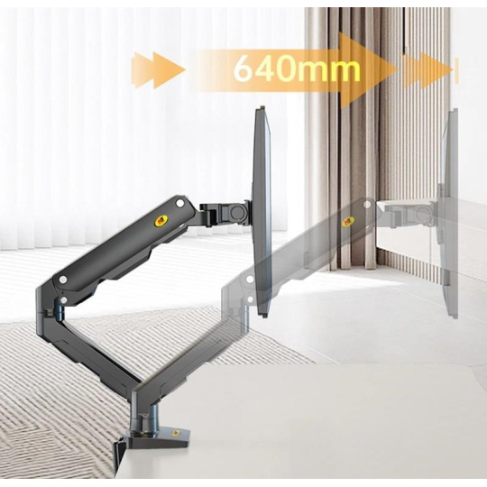 Držák na monitor Tv NB G50 Profesionální stolní držák na širokoúhlý monitor nebo All in One Pc 27-45", otočný +/-180°, sklopný +60°/-15°, nastavitelná výška od stolu 190-475mm, nastavitelná vzdálenost 0-640mm, 1x port USB, 2 typy stolních úchytů, systém vedení kabeláže, VESA stndardy 75x75 a 100x100, nosnost 16kg Jeden z nejkvalitnějších stolních držáků pro zavěšení širokoúhlých monitorů nebo All in One PC - profesionální, poctivá konstrukce, dizajn propracovaný do detailu a velmi snadné polohování. Držák doporučujeme i náročným zákazníkům, do vytížených provozů, kanceláří nebo showroomů. Své uplatnění najde na každém stole. Držák je ideální na širokoúhlé i klasické monitory, All in One Pc nebo televizory s úhlopříčkou 27-45", u širokoúhlých monitorů může být úhlopříčka i větší. Podmínkou je hmotnost v rozmezí 5-16kg, u lehčích obrazovek nebude možné výškové polohování. Držák podporuje VESA 75x75 a 100x100, v případě potřeby nabízíme i rozšíření na 200x100, 100x200 a 200x200. Kompletní polohovatelnost: otáčení +/-180°, naklápění +60°/-15°, snadné nastavení výšky díky plynovému pístu od 195mm až do 475mm, nastavení vzdálenosti od úchytu 0-640mm, funkce pivot, port USB, propracované vedení kabeláže, 2 typy stolních úchytů. Profesionální stolní držák na širokoúhlé monitory a All in One Pc NB G50 Technické údaje: minimální hmotnost monitoru nebo Tv 5kg maximální hmotnost monitoru nebo Tv 16kg podporuje VESA standardy 75x75 a 100x100 doporučená úhlopříčka monitoru Tv 27" až 45" ideální na širokoúhlé monitory, zobrazovací zařízení, All in One Pc nebo televizory otáčení do stran +/- 180° naklápění +60° / -15° nastavení výšky od stolové desky 195mm až 475mm výškové polohování 280mm nastavení vzdálenosti od stolního uchycení 0-640mm funkce pivot - horizontální nebo vertikální otočení obrazovky 1x port USB na základně držáku systém vedení kabeláže 2 typy stolních úchytů (na okraj nebo přes otvor do prostoru) barevné provedení černé záruka 5 let Profesionální stolní držák na širokoúhlý monitor NB G50 Stolní držák na širokoúhlé monitory Tv NB G50 podporuje VESA standardy: VESA 75x75 VESA 100x100.
