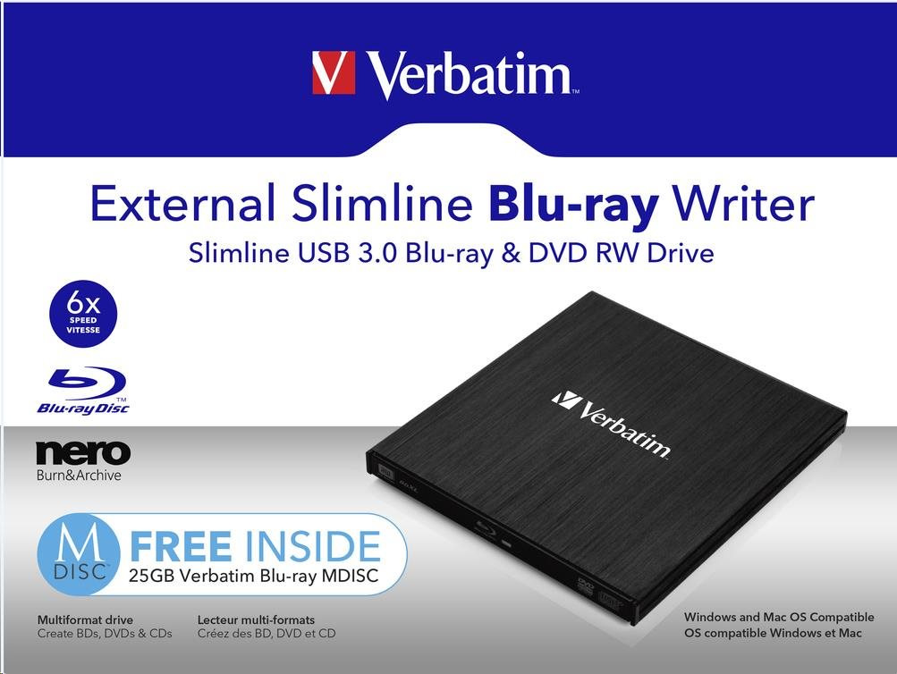BAZAR - VERBATIM externí mechanika Slimline Blu-ray Rewriter USB 3.0 Zdarma BR Disc 25GB (CD DVD BD Mdisc) +NERO - Poško