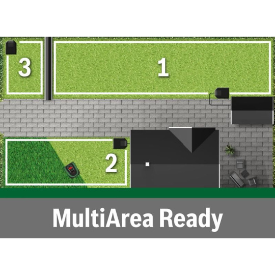 Díky funkci MultiArea poseče více travních ploch (až do 700 m2) a vypořádá se s úzkými průjezdy (75 cm mezi dráty).