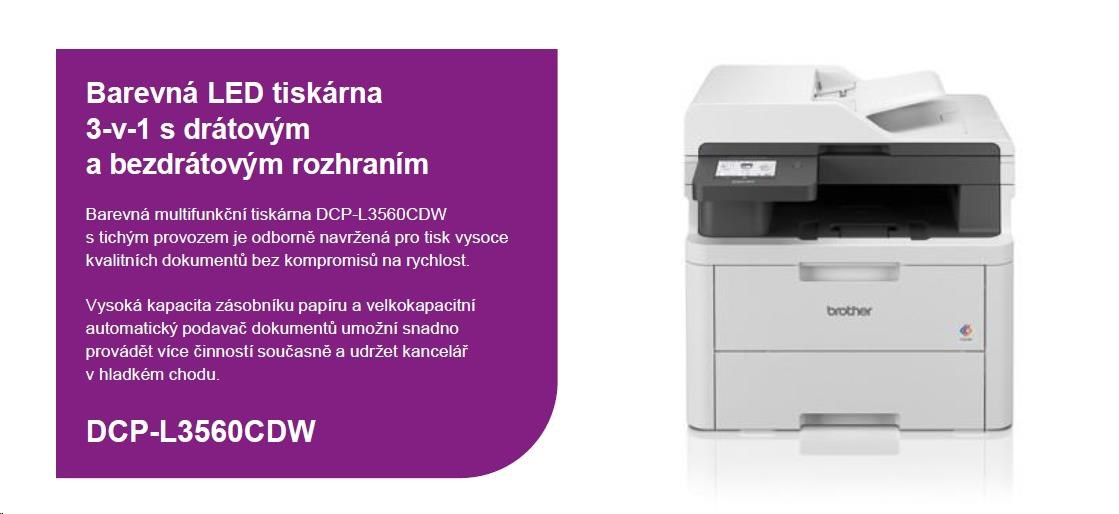 BROTHER multifunkce color LED DCP-L3560CDW - A4 26ppm 512MB 250listů USB WIFI LAN ADF50 duplex